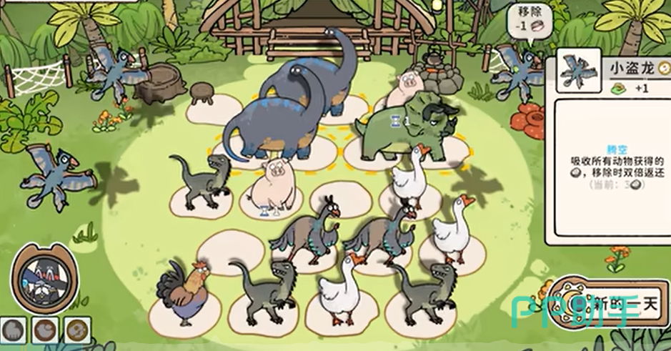 刚开始玩的时候,先靠迅猛龙卡牌打基础。只要场上凑齐3张一样的迅猛龙卡,就能拿到1个化石,这可是攒化石的起步资源。而小盗龙更厉害,它能 “飞” 起来,所以它不会占用地面位置,还能把得到的所有化石都存起来,特别实用!卖的时候能赚双倍的钱,而且这个双倍效果还能和其他加成进行叠加,把这两张卡用好,就能更快地攒到一堆化石。