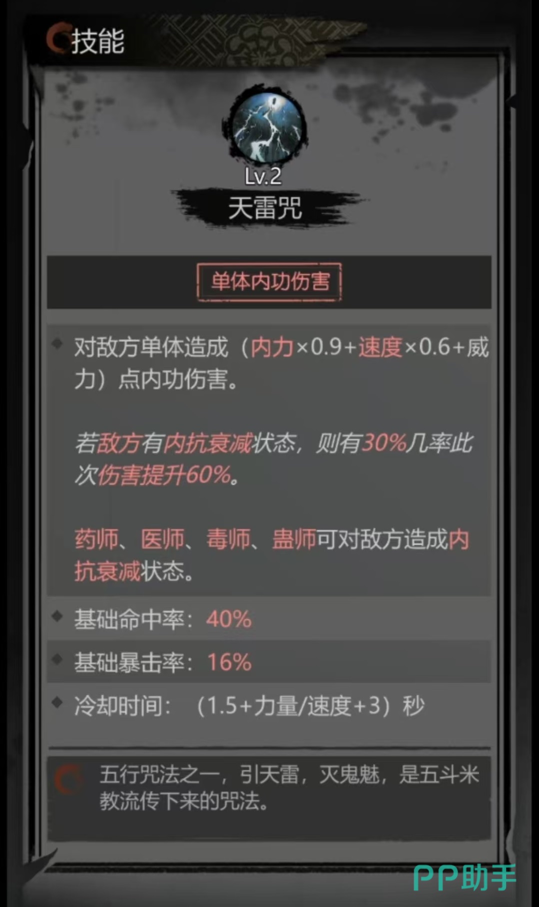阴阳师是由方士转职而成的职业,所以也具有了方士的部分特点,在输出和辅助方面都比较出色。在战斗中,无论是单体内功输出还是群体内功输出以及群体治疗等方面,都有出色表现。自身的核心技能是天雷咒和爆炎符。天雷对双单体造成内功伤害,如果对方身上带有内抗衰减状态,则此技能输出时有机率提高伤害。