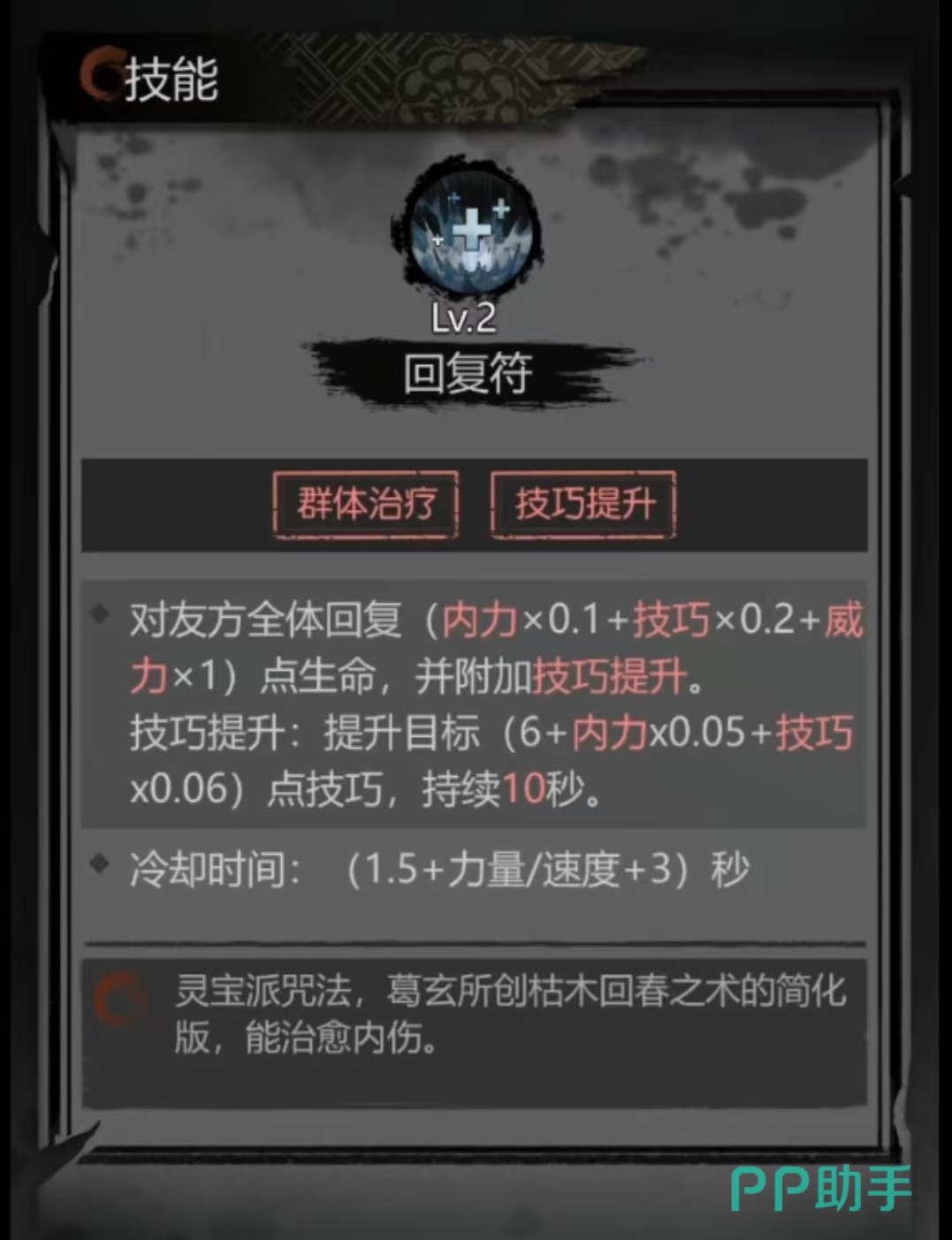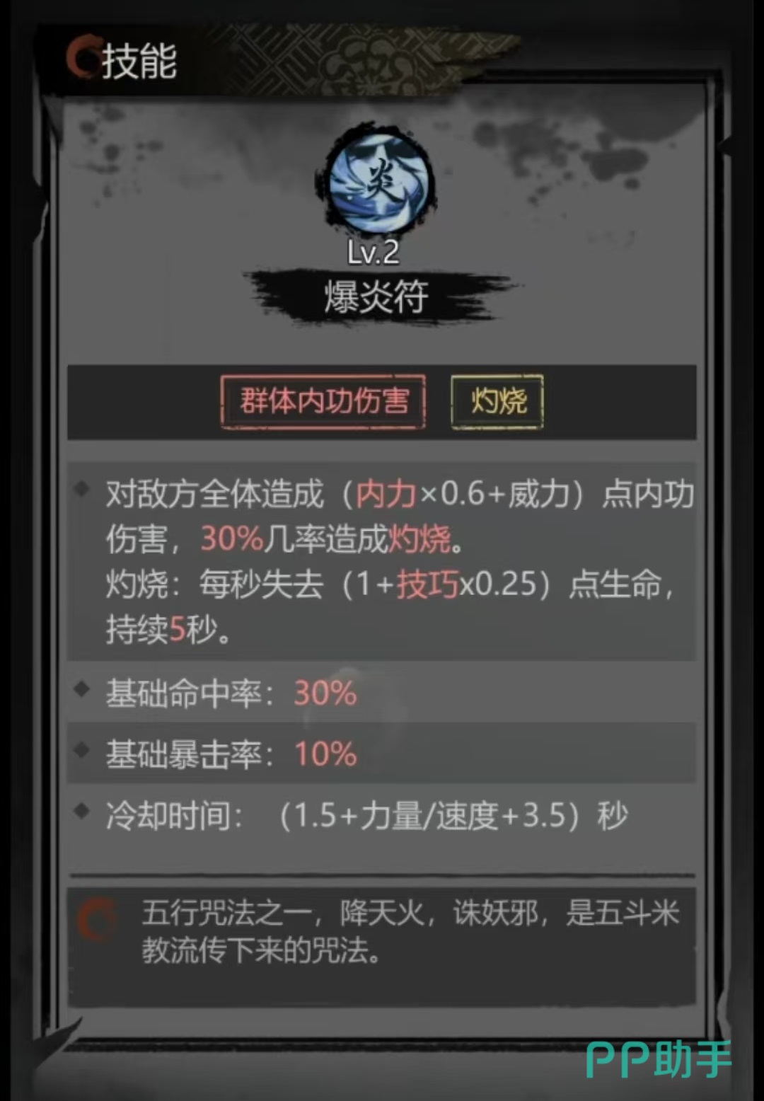 药师、医师和毒师等职业,都可以对敌方造成内功衰减状态,所以他们是阴阳师的好伙伴。爆炎符是属于群体内功伤害类型,除了直接伤害之外,还有几率造成灼烧,让对方在持续时间内会自动失去生命值。还有一个技能是回复符,这是属于群体治疗和技巧提升类型,对全体角色恢复生命值并附加技巧提升。技巧提升效果,可以提高目标的技巧属性,持续10秒钟。