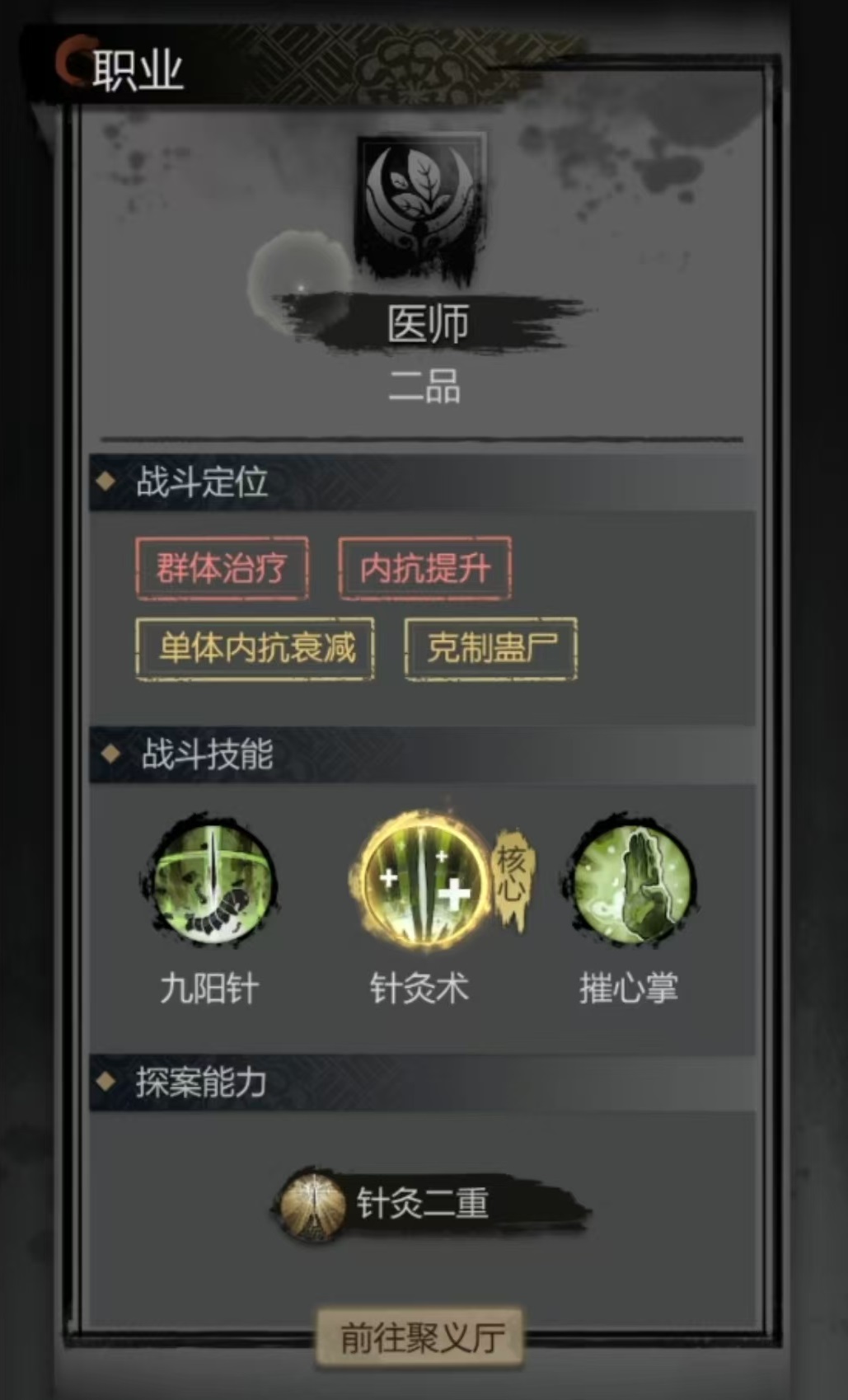 医师属于药师转职而来的二品职业,后续还可以转职成四品医师,但是在技能效果方面是非常接近的。医师在战斗中具有群体治疗、内抗提升、单体内抗衰减和克制蛊尸等一系列优势。战斗技能主要包括九阳针、针灸术和催心掌。核心技能是针灸术,另外它还具有针灸二重的探案能力,在需要针灸的场合下有着出色的应用。