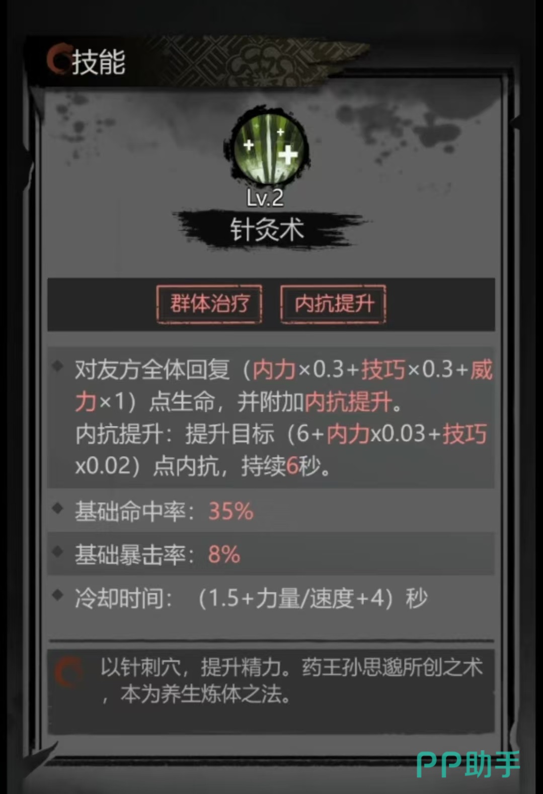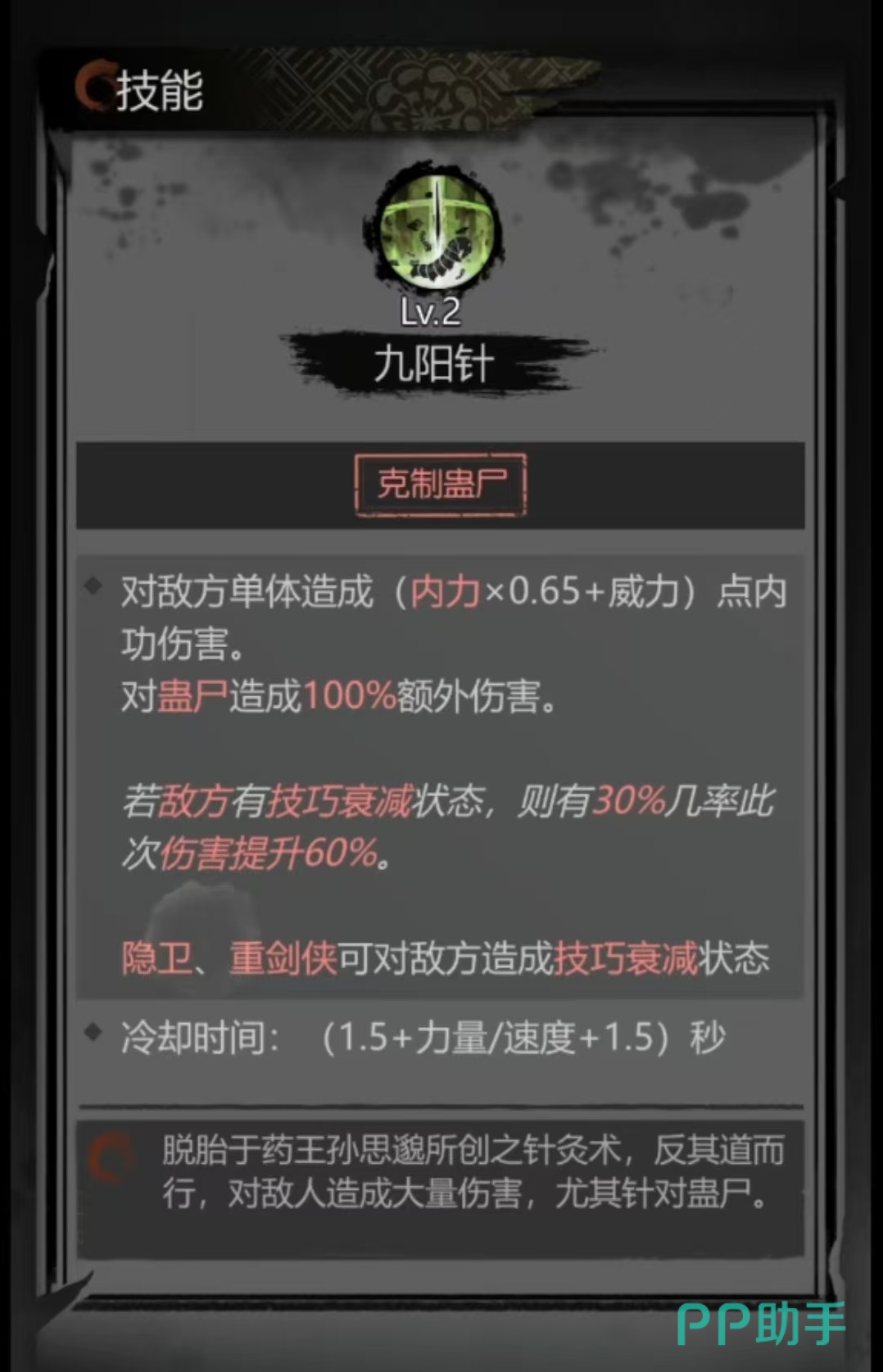 九阳针是属于克制蛊尸类型的技能,可对敌方单体造成内功伤害,对蛊尸有额外100%的伤害加成。如果对方身上带有技巧衰减状态,则有几率使此次伤害提升60%,隐卫和重剑侠这两个职业可以对敌方造成技巧衰减,在搭配的时候可以利用这一点。针灸术具有群体治疗和内抗提升这两大核心优势,对于己方全体目标恢复生命值。并附加内抗提升。内抗提升效果可提高目标的内抗,持续6秒钟,这样在对付内功输出比较强的敌人时,就有着不可替代的作用。
