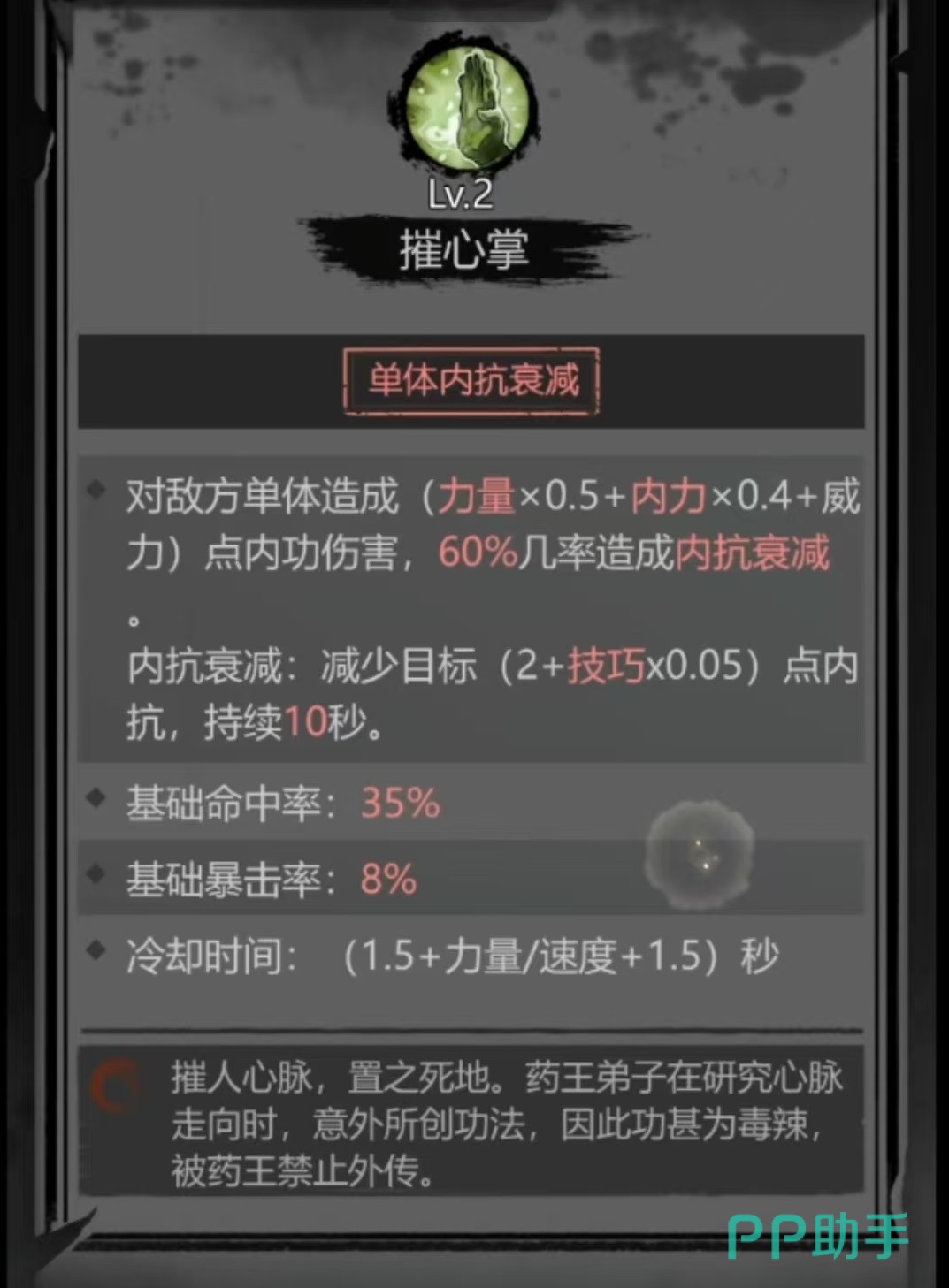 催心掌除了对敌人造成单体伤害之外,还有几率造成内抗衰减,内抗衰减效果可降低目标内抗,持续10秒钟。降低内抗之后,我方的内攻型输出就可以打出更高的伤害,所以医师很适合与阴阳师这样的内功输出强势职业一起搭配起来。作为游戏中的核心治疗职业,医师在团队中有着不可替代的作用,无论是降低抗性提高输出,还是在持久战中进行续航,都是队伍中不可或缺的角色。