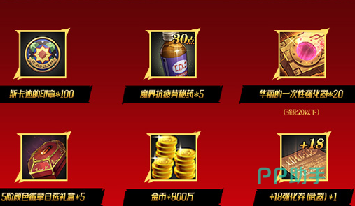 当版本7月23号上线后,首先要与大家见面的是一个送礼活动,在活动期间玩家只需要在指定时间登陆游戏,那就可以领取到一张加18的武器强化卷、100个斯卡迪印章、5个30点的疲劳药、20个一次性强化、800万的金币和5个五阶颜色徽章自选礼盒。