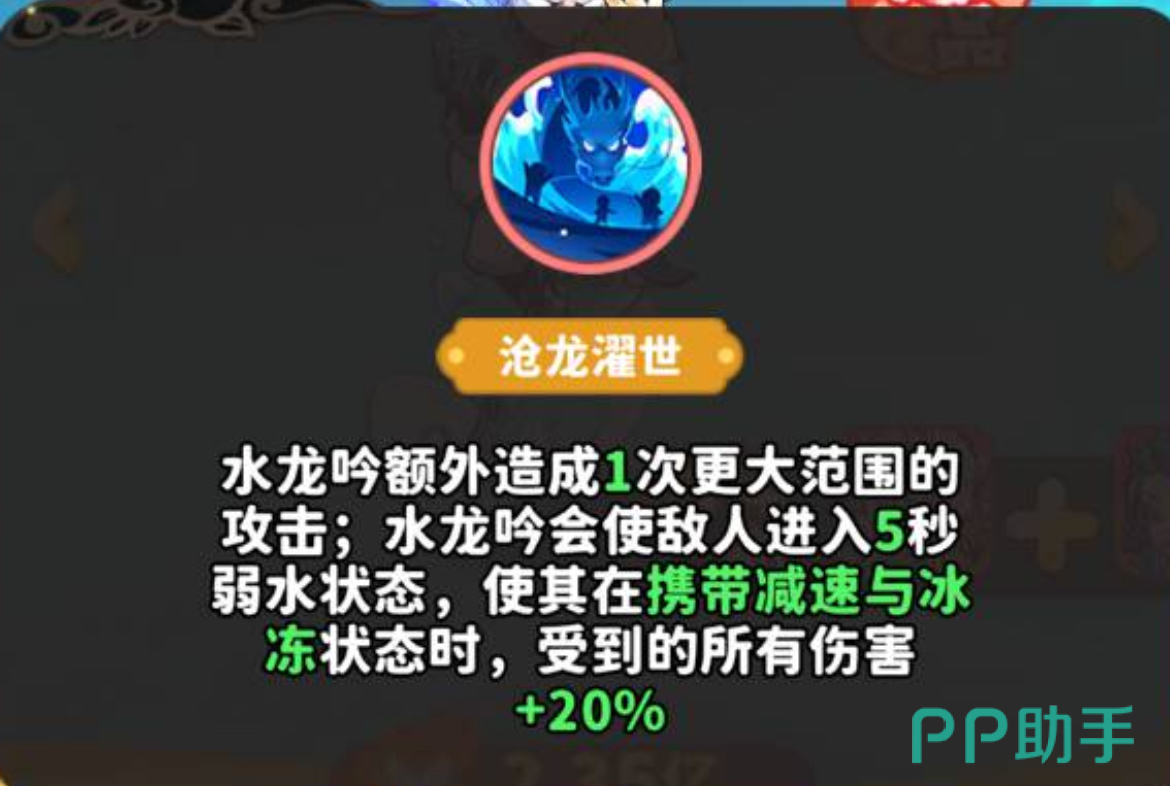 该技能是前两个技能联动的主要纽带,能够彻底激活前两个技能所带来的价值。首先它可以是“水龙吟”从单体伤害提升为范围技能,这样就可以大幅度提高清怪效率。其次就是它可以给敌人附加5秒的弱水效果,中了弱水效果的敌人,只要进入减速或者冰冻状态,都会受到额外增加的伤害值,包括水龙吟技能自身的冰冻效果,以及其他水系技能的减速效果。