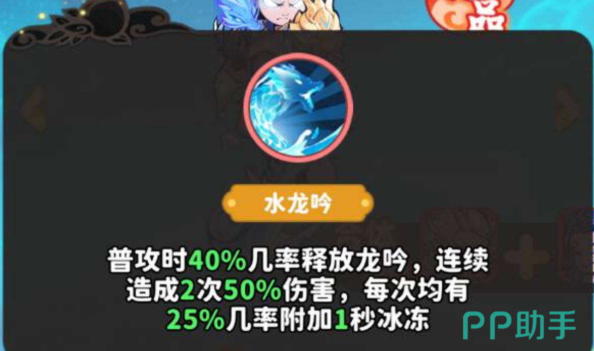 水龙吟的普攻有40%的概率能触发两段连续伤害,且每段有25%概率附带冰冻效果。所以该技能不仅可以保持持续输出效果,同时也兼具控场干扰的效果。冰冻可以打断敌人的施法和走位,在参与boss战时可以利用冰冻强制打断boss的核心技能,比如妖王的狂暴连招。虽然比较依赖普攻频率,但是搭配水系阵容的“攻速增益”就可以进一步的提高触发冰冻概率。