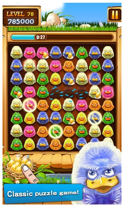 一款休闲消除类手游,三消类玩法搭配各种颜色的卡通画风鸭子,交换相邻鸭子位置实现三消,特点在于能合成像是黑洞鸭等各种带特效的超能力鸭子,另外还加入了金蛋系统,消除带蛋鸭子能获取复活道具,游戏采用Q版卡通画风,鸭子的造型夸张,音效欢快,游戏的整体节奏也比较快,非常适合碎片时间内开一局。