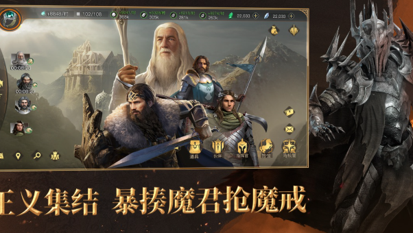 游戏完美复刻了原著中三大种族的特色兵种——凶悍的兽人军团、优雅的精灵射手以及坚毅的人类战士,让玩家亲身体验指挥千军万马的快感。超过百万格的大型沙盘地图,完美呈现了从夏尔到魔多的经典场景。独特的"英雄助战"系统让甘道夫、阿拉贡等电影角色化身战场指挥官,而创新的"资源囤积"玩法则打破了传统SLG的疲劳感,让每场战役都充满变数。