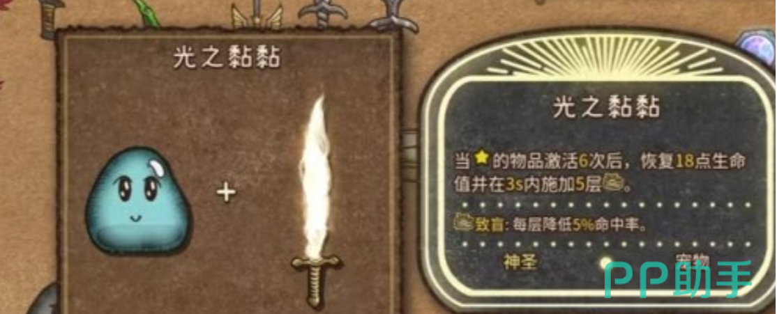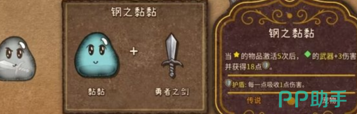 钢之黏黏是一种可以给武器增加3次伤害的并且还能获得18点护盾效果的武器,护短每一点都能够吸收1点的伤害,需要用普通黏黏和勇者之剑才能合成。