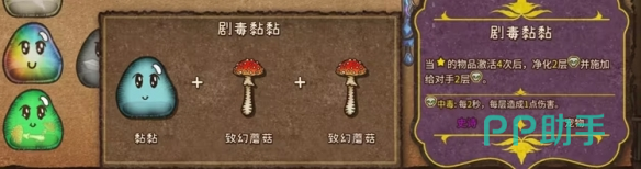 这四种黏黏都离不开不同的黏黏,剧毒黏黏是一种能够净化自身中毒特效同时给对手附加上2层中毒buff的黏黏,这种黏黏需要使用普通黏黏和2个致幻蘑菇来合成。