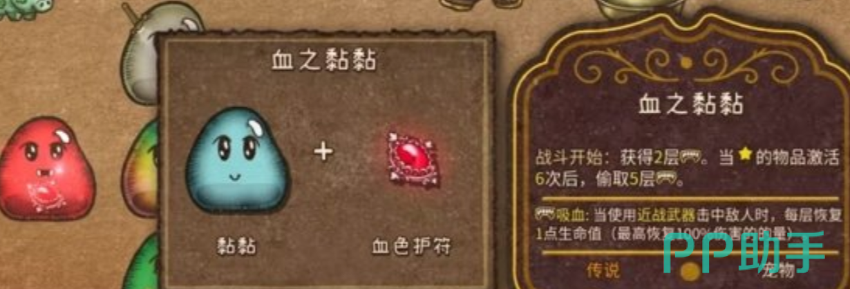 血之黏黏在战斗开始的时候能够先让自身获得2层吸血的效果,当黏黏在激活6次以后还能直接偷取5层吸血,吸血效果能够恢复1层生命值,合成的话需要普通黏黏和血色护符。