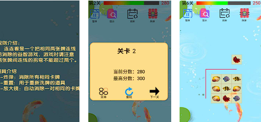 游戏中拥有超多好看的鱼类出现,每一个关卡你都需要点击相同的鱼类进行连连看消除,捕捉到更多鱼类之后,你还可以收获丰盛的奖励,这些奖励可以帮助你在下一个关卡中利用更多强力道具。游戏还有着各个背景的更换,无论是湛蓝还是青绿都可以给玩家带来眼睛的放松,最舒服的一次海洋捉鱼连连看等着你加入。