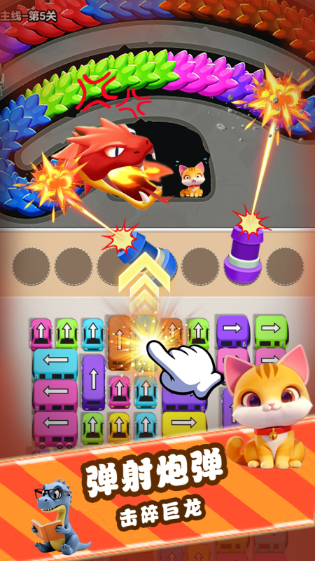 在这里,轻触屏幕中那绚丽多彩的方块,瞬间就能召唤出超级可爱的发射装置,然后果断瞄准那正四处游走的巨型飞龙展开攻击!这条巨龙可不简单,它浑身由各色方块拼接而成,只有操控与巨龙身上方块同色的发射装置击中它,才会“嘭”地一下消除对应方块。每一次精准击中方块,看着它们纷纷炸裂开来,仿佛所有的压力都随着这绚丽的爆炸烟消云散。