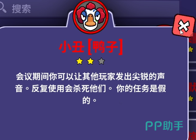 小丑是最近新出的角色,它属于鸭子阵营。其本身的技能很有趣。它的技能是在会议的时候可以让其他的玩家发出尖锐的声音来扰乱会场,在反复使用之后将会杀死他们。小丑的任务都是假的。这个角色从技能来看是非常有趣的,此职业本身虽然理解不难,但是使用难度很高。