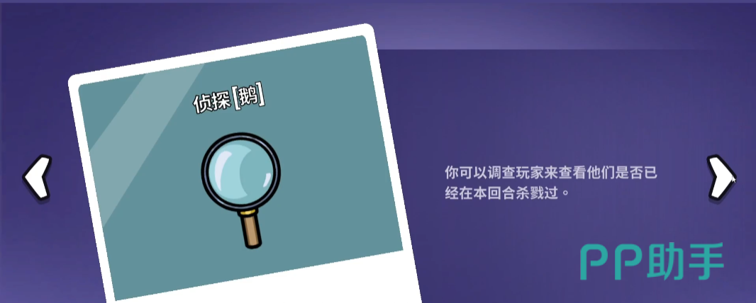 预言家是鹅阵营的好人角色,也是队伍里能获得关键信息的重要角色,侦探的技能就能给本阵营揭露其他玩家的身份,找出隐藏起来的鸭子,帮助队伍排查出真正的鸭子是谁,它的技能也很好理解,就是能直接查验玩家是否在上轮杀过人;