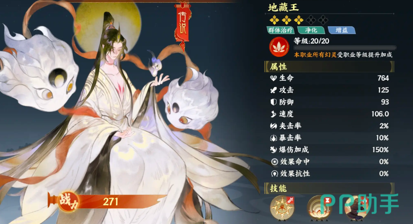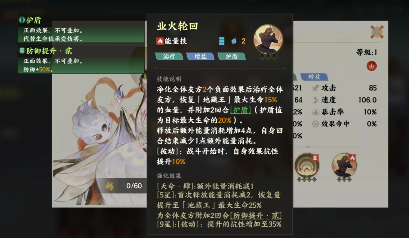 地藏王的普攻技“慈悲掌”会攻击一名敌人,造成60%伤害后,治疗百分比血量最少的队友,他的回合技“净罪明王”可以净化一名队友的1个负面后,对其进行治疗回复其自身20%的血量,并让该队友额外得到攻击提升效果。