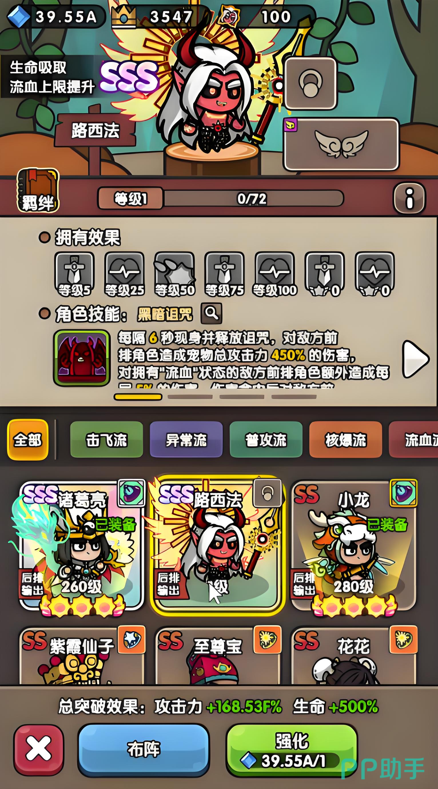 游戏中目前确认的sss角色有太上老君、诸葛亮和路西法这三位,拥有着独立的技能和流派,大多数场合使用诸葛亮都可,要是在pve战斗中可选路西法,诸葛亮是属于增益控制类的角色,由借东风、八卦阵和阵容增益组成的三大技能,可帮助队友提高增益带来持续输出,对boss产生眩晕和高额群体伤害。