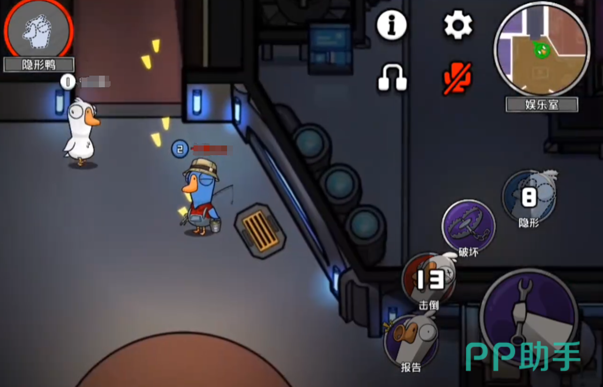 该觉得拥有隐身能力,只需要按下技能键后,隐形鸭可以隐身 5秒,期间移动速度提升,视野变灰,且无法看到其他玩家。在隐身期间,如果靠近其他玩家,攻击键会亮起,此时可以出刀,且击杀后不会显形。不过也要注意周围有没其他玩家,不然很容易被发起会议踢出去。