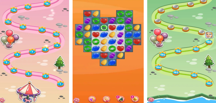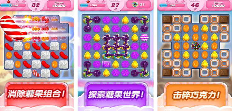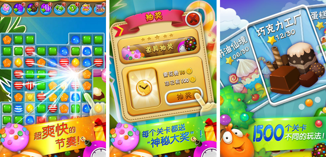 《糖果传奇》是以糖果为主的三香类休闲小游戏,其核心玩法就是交换相邻的糖果,然后让相同糖果形成个或三个以上并消除。当然除了三消以外,四个或者五个相同的糖果也会消除并生成特效。游戏采用的是闯关模式,每个关卡的目标都不同,完成相应任务即可轻松过关。游戏目前以糖果镇和巧克力山谷为地图,想要解锁新区域还需要达到指定的行数量。