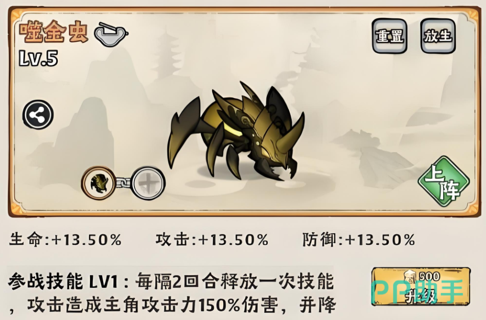 第二个要介绍的就是噬金虫,噬金虫可以说是最有性价比的一只灵宠了,因为这个灵宠只需要300御兽符即可兑换,而御兽符则是从我们日常打怪刷图即可掉落。同时,其培养材料同样可以通过御兽符来兑换。因此这个灵兽整体的培养不需要玩家花费太多的道具,可以说有着非常高的性价比,很适合零氪玩家。同时它的定位是输出型灵宠,技能是每两回合会造成一次伤害,将其培养起来,不管是推图还是PVP,伤害都是非常可观的。
