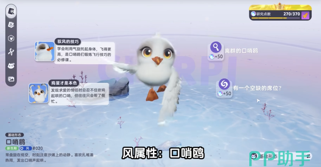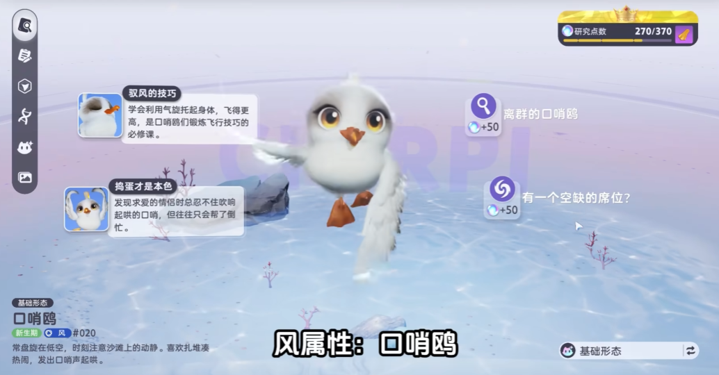口哨鸥:超大眼睛的萌鸟,在新叶台地,云上草原,星落林等多个地方都可以找到它。初始就拥有2级滑翔能力,玩家变身之后就能滑行,快速移动。主动技能龙卷风可以生成小型风场,伤害力兼备。