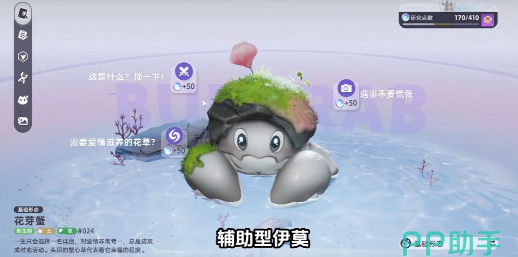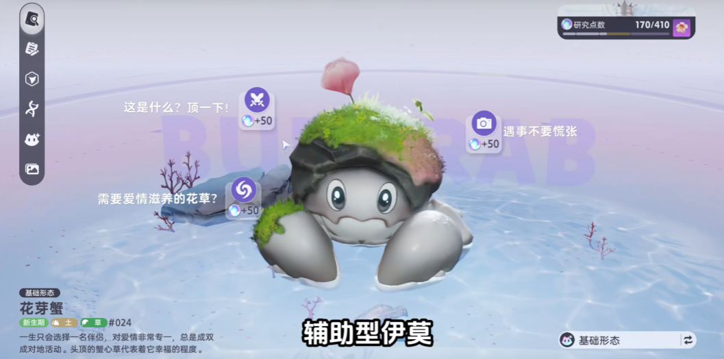 花芽蟹:辅助定位,生活在不同的区域就会有对应的颜色以及形态,海湾形态下就是全身被烤红的颜色。它拥有独特的钻地技能,可以免疫远程招式,还能击碎岩石。