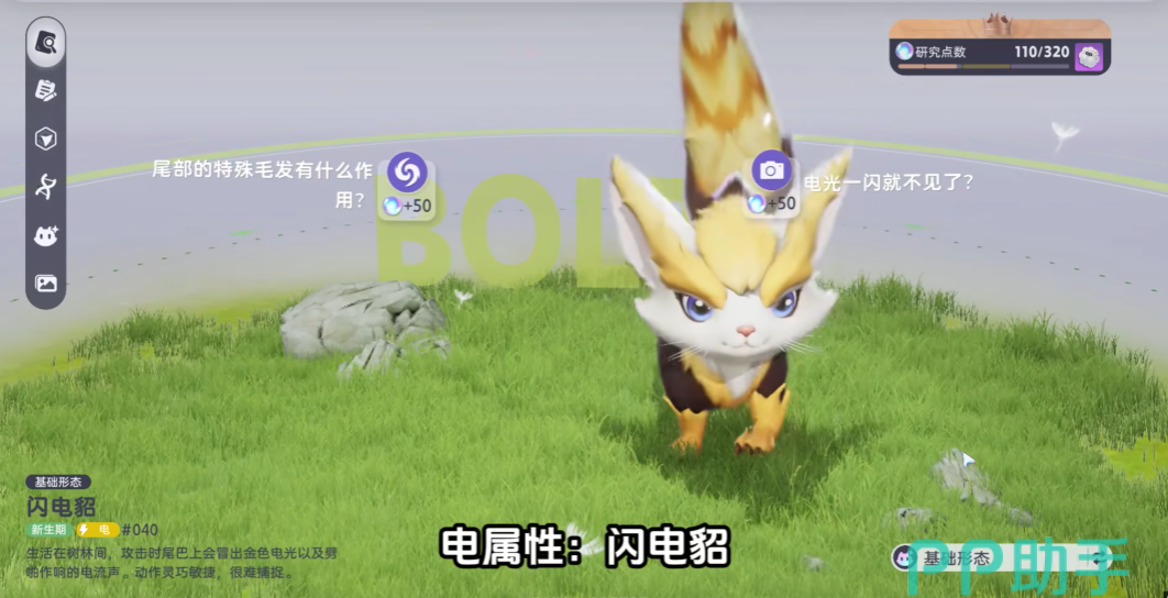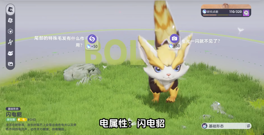 闪电貂:可爱的黄色貂鼠,生活在树林里,尾巴可以释放电属性攻击,在解谜时能起到重大作用,可以触发电气机关。另外它还拥有2级攀爬能力,垂直的岩壁也能轻松爬上去。