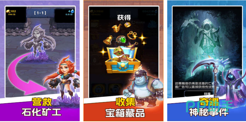 本作是款气氛十分轻松的魔幻主题挖矿类型游戏,放置挖矿的基础操作并无任何的难度,营救矿工和收集道具等超多玩法也值得挑战,在挖矿过程中能触发许许多多的奇遇事件,多种地形也会让大家遇到形形色色的神秘生物,愉快悠闲的挖矿过程会帮助大家舒缓压力,开启宝箱也有机会胡得更多矿脉方面的资源。