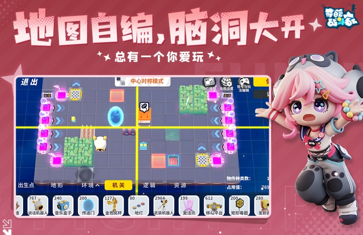 首先,玩家们可以四人成行,来进行各种射击混战,而且还有道具的投放,以及角色的技能展现。另外,对局里的道具都以奇葩为主,它们的效果更是很奇怪,不仅能晕眩玩家,还能持续扣除血量。有趣的是,战斗的地图是能自由编辑的,各种障碍物都能增加战斗乐趣,还有机关设计的加入。