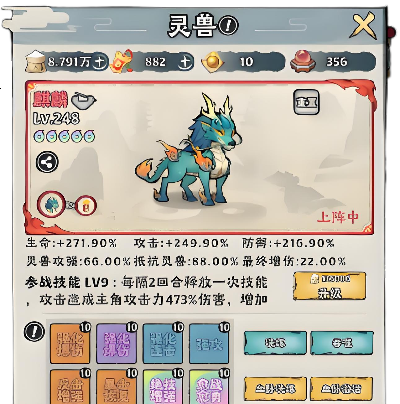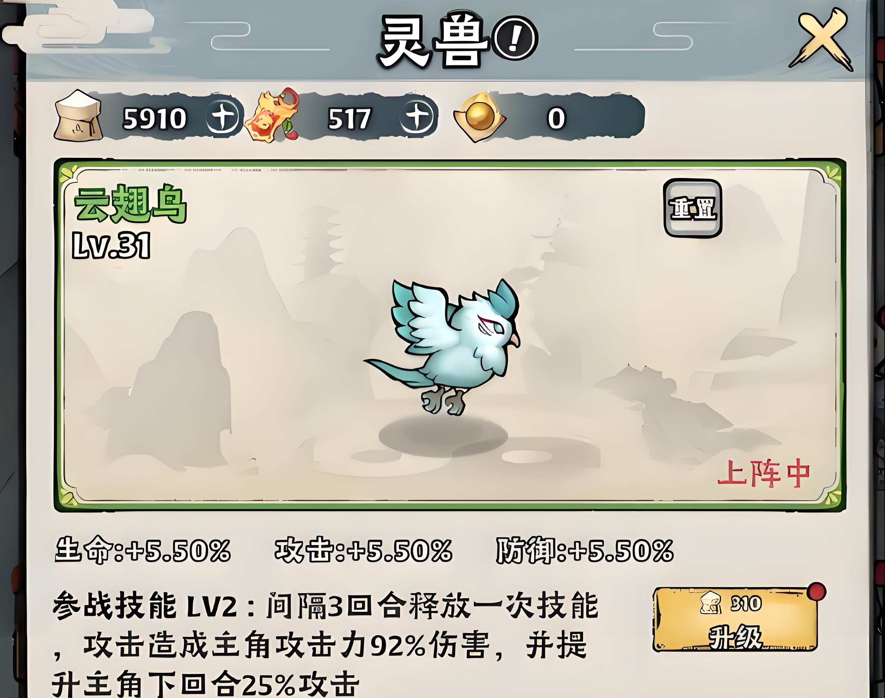 在获得了灵兽后对其进行培养,也能提升角色的攻击战力,在养成上同样也是尽可能选择高梯度的灵兽,如果是平民党的话建议选择云翅鸟,不仅获得难度低而且养成需求也不高,在战力加成上也有一定的提升。