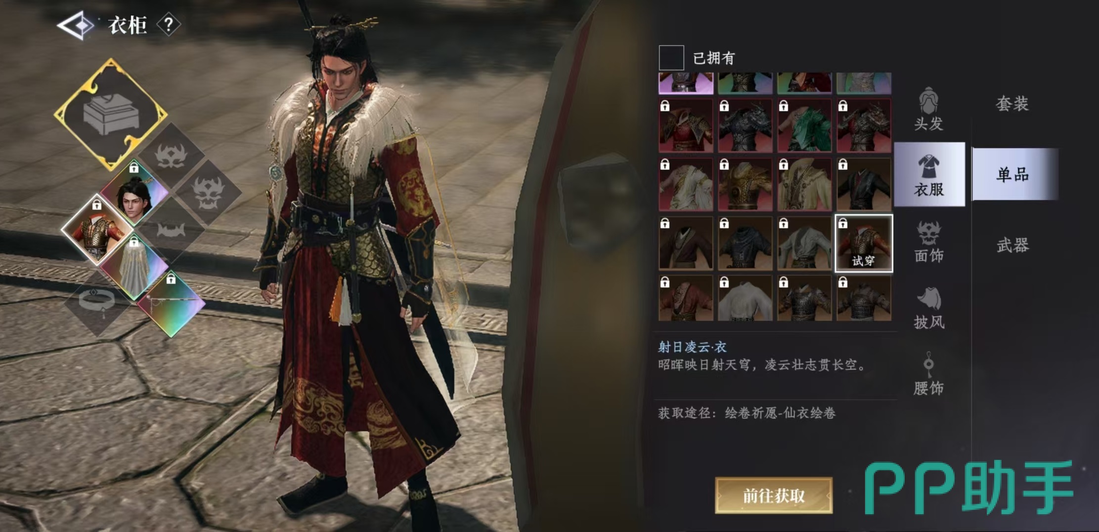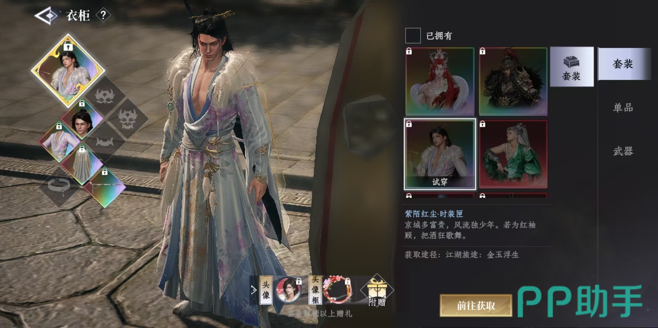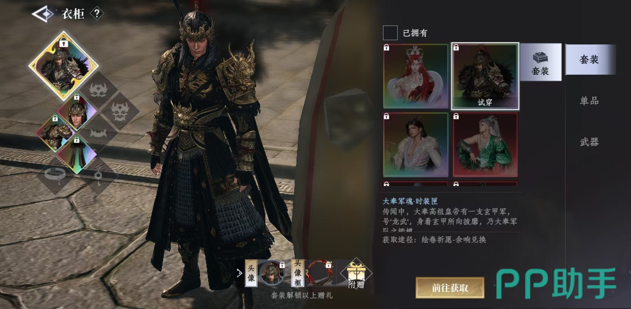 大家在衣柜中可以看到有多种不同的选项,主要分为套装、单品和武器。套装是目前游戏主推的外观类型,所有都已经搭配完毕,非常符合玩家的审美,直接选择套装试穿,然后确定入手就可以了。每套外观的下面都有获取的途径和方式,直接点击前往获取,就能够成功入手。例如有些是通过战令解锁获得,有些是通过绘卷祈愿获得,还有些是通过宝钞购买等,在衣柜中操作非常方便。