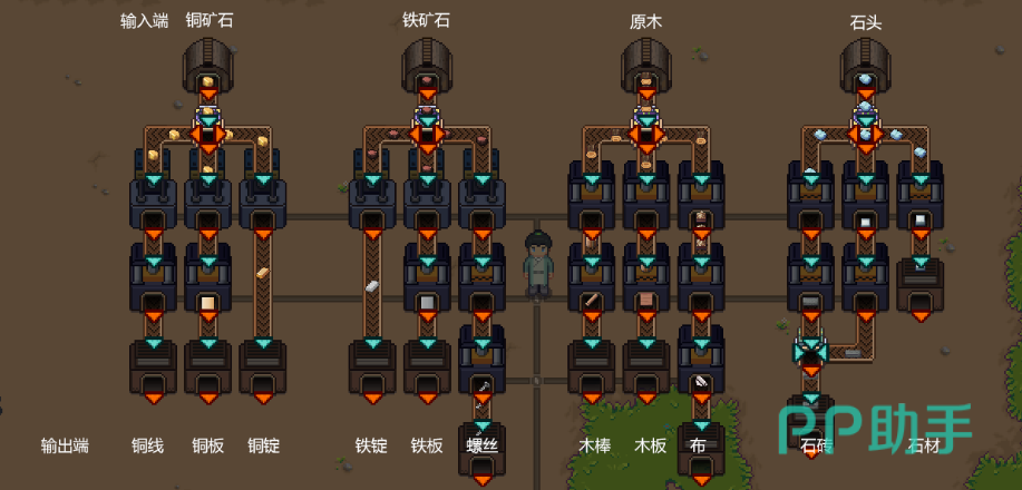 原木的3条线,一条产出布、一条产出木板,一条可以再用木材来制作木棒,铁矿石3条线,两条连接制造机的分别产出铁板和螺丝,铁锭不加工的原因的是因为前期用处很多,可以线存着,铜矿石的3条线连接制造机的分别制作铜板和铜线,铜锭不加工的原因和铁锭相同。