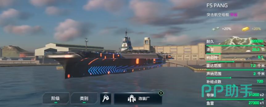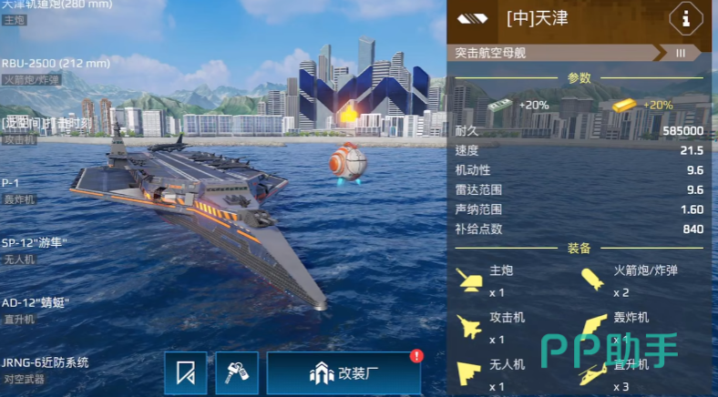 在新版本中虽然也获得了一枚导弹的加强,但依旧面临较为尴尬的处境。暴风雨拥有三枚导弹、两门火箭炮与两架直升机,在纸面上拥有全突航最强的自保配置,但其本体血量、机动与速度在突航中均为倒数,基本无法转点,稍一被锁定就可能被战列舰远程收割。三枚S400组成的防空系统也难以有效阻挡高强度导弹攻势,且缺乏无人机让其进攻维度受限。不过,对于新手玩家来说,暴风雨依旧是一艘门槛低、不怕被偷的稳定航母,用以熟悉航母节奏与操作逻辑是相当不错的选择,只是实战强度上难以与一线航母抗衡。