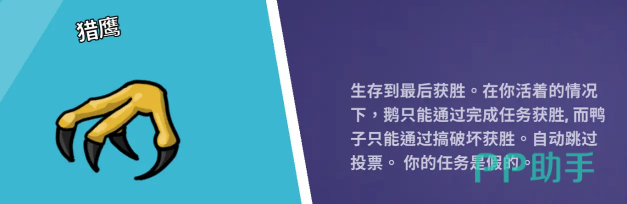 猎鹰想要胜利的话,除了需要活到最后同时还需要有能刀别人的能力,猎鹰在活着的情况下,鹅只能通过把任务完成来取得胜利,鸭子的话只能通过搞破坏来取得胜利,而且猎鹰还可以直接跳过投票的阶段。