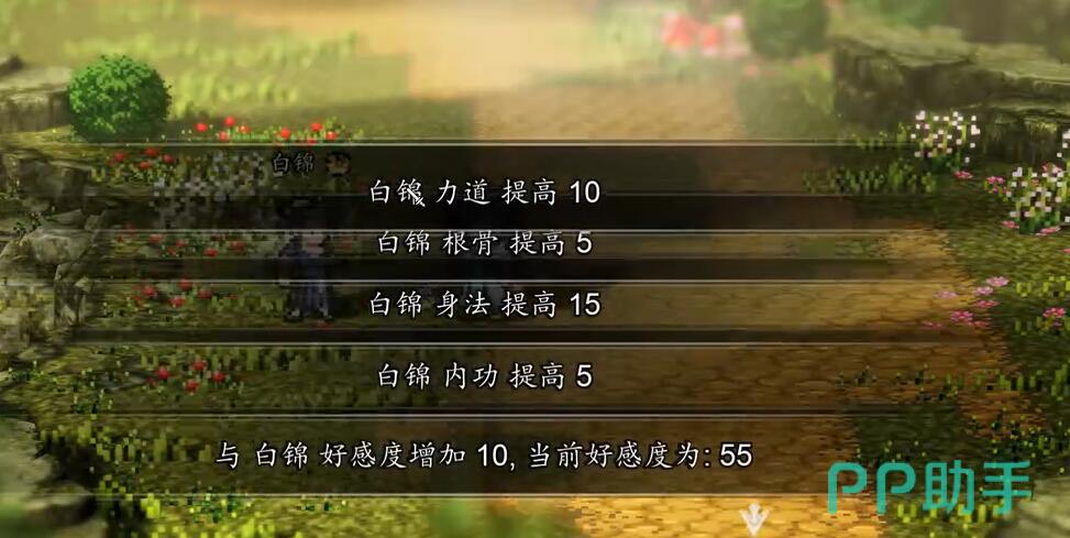而他的第二个剧情,则是需要到落英林去触发,这个剧情需要玩家准备5瓶青梅酒,玩家可以提前准备好了再去,免得浪费时间。而在这里,通过了剧情之后,玩家就可以让白锦入队,并且让他有基础的五十五好感度了。想要解锁他的下一步剧情,玩家需要通过送礼,当你送到60好感度的时候,你就能解锁断天绝景的任务了。