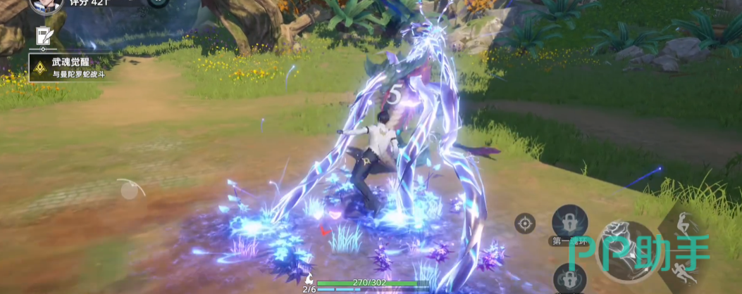 此时大家进入的其实是直接战斗的一个场景,会看到一大圈的曼陀罗蛇,此时剧情中会发现自己现在的实力无法战胜曼陀罗蛇,这时候会有个灵魂出现,这个灵魂其实就是对大家进行引导的身份;