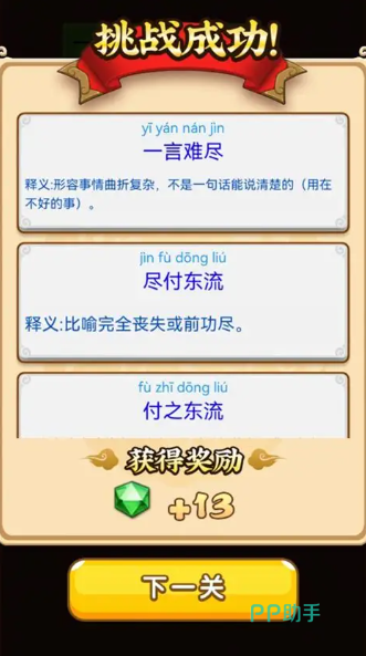 玩家在闯关过程中会体验到层层递进的智力挑战,每个关卡都像打开一个文化宝盒——当你成功串联起正确的成语组合时,系统会以动态演绎的方式,生动展现成语背后的典故渊源。这种寓教于乐的设计,让原本枯燥的成语学习变成了充满惊喜的探索之旅。难度曲线经过专业设计,既保证新手能获得成就感,又能让资深玩家感受到持续突破的乐趣。