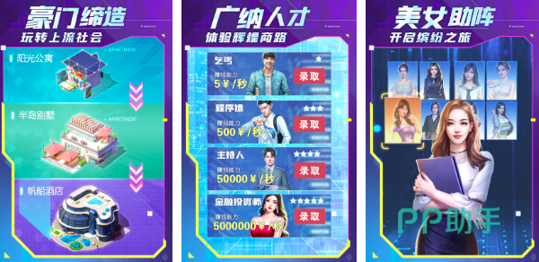 在全民投资人中,你可以享受到完美的商业养成模式,打造自己的专属公司,招揽行业精英,收购不同行业公司,不断提升个人影响力。作品当中的公司养成、角色养成更注重多维化,可以让玩家实现平衡性发展。还可在线自由打造商业城市,将商战玩法和经营玩法融为一体,真实互动感满满。