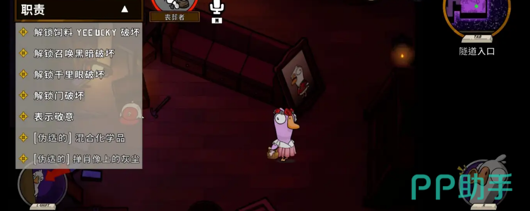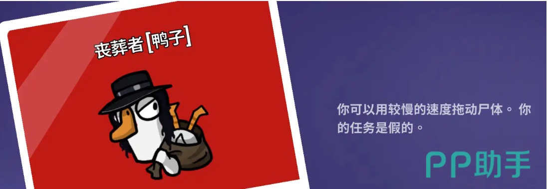 丧葬者在鸭子阵营中也被成为承办丧葬者,既然是丧葬者,那么它首先肯定是有着刀人的能力,刀完人以后,丧葬者可以用比较慢的速度去拖动尸体,丧葬者只要在快要靠近尸体的时候点击一下空格,这样就可以直接抓刀尸体了,然后在拖动着进行移动就可以挪动刀其他的地方了,不过在拖动尸体的时候,要注意拖动尸体移动的移动速度要比自己移动时的速度慢上很多。