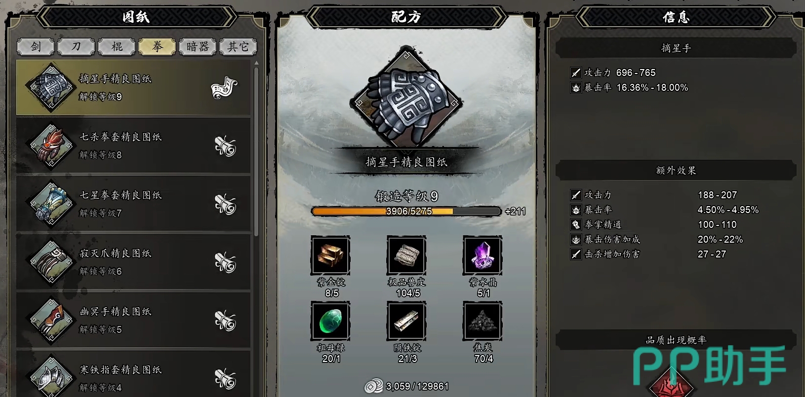 以上就是逸剑风云决摘星手获取方法分享。摘星手的获取难度并不是很大,玩家们在过完剧情后也可以直接学习它的制作方法,并将成品做出来,并且它是一个很好用的拳套,主用拳的玩家可别错过。