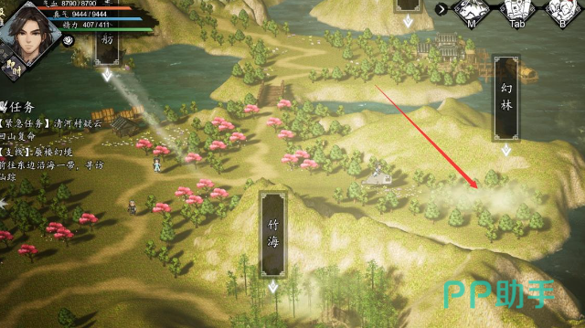 在完成梧桐村里的任务之后,玩家们可以前往驿站,此时就能够触发与蜃楼幻境相关的剧情了。而该副本的具体位置就在竹海旁边的幻林中,小伙伴们只需要根据小编在图片中所标注的箭头提示前往即可。这个副本的特点就是只能玩一次,不能重复通关,因此小伙伴们在进入该副本之后,就要确保一次能够把所有的奖励都给拿到,绝对不能漏掉。