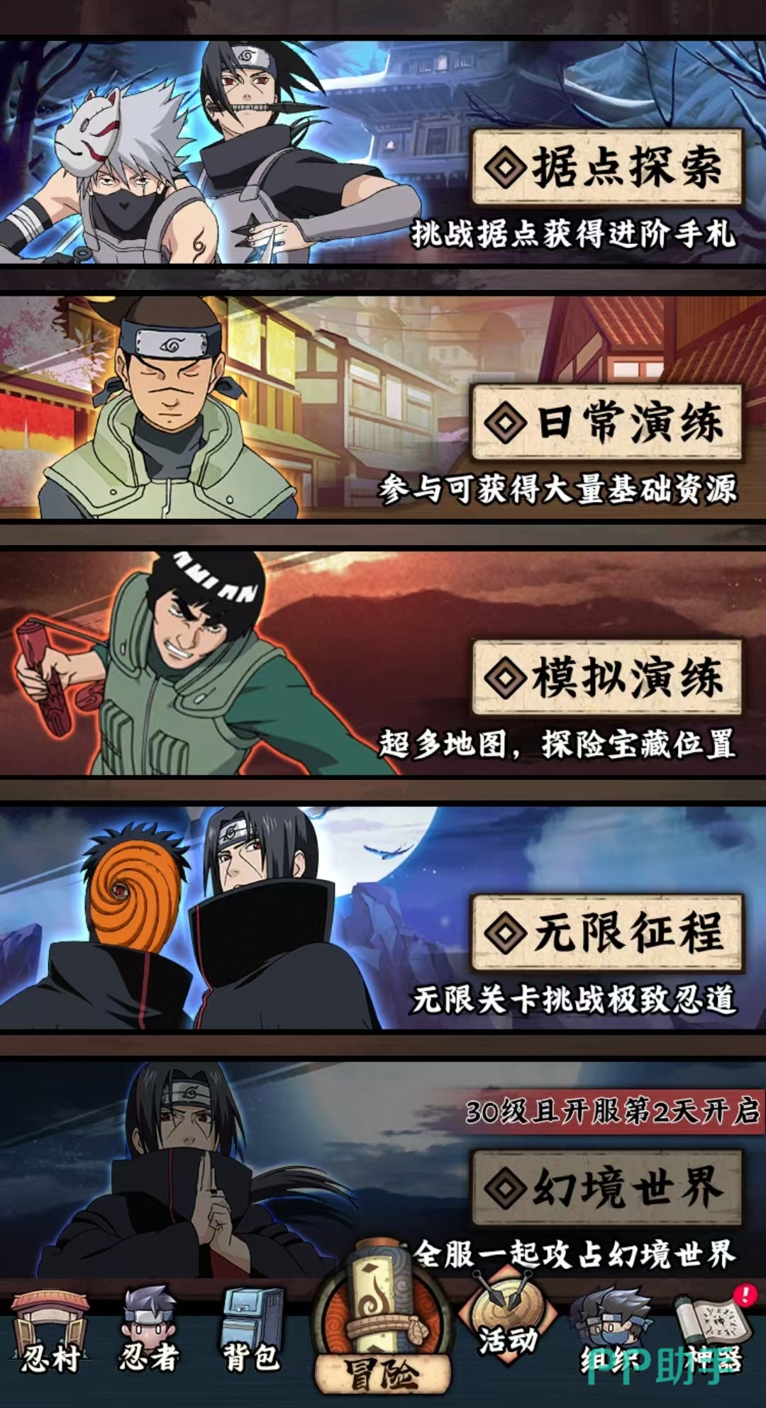 以上内容就是小编今天给大家带来的火影忍者木叶高手养成攻略介绍,如果不想在游戏中氪金去获得资源,那么就要积极参加各种活动。每天上线将挂机奖励领取完毕,然后尽力去挑战主线和副本,只有这样才能积累资源去养成。