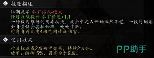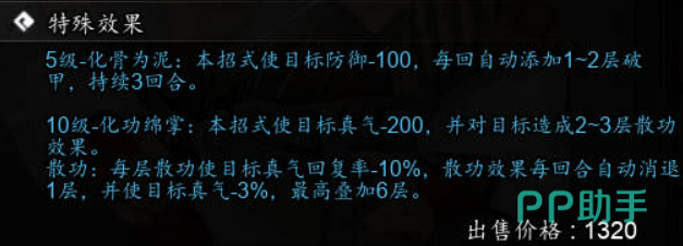 随着技能的升级,化功绵掌的效果会逐渐变得更加强大。到了5级,技能会增强为“化骨为泥”,此时目标的防御将直接降低至-100,并且每回合都会增加1到2层破甲效果,持续3回合。这使得化功绵掌在长时间的战斗中表现得尤为出色,能持续压制敌人,为后续的攻击创造更有利的条件。