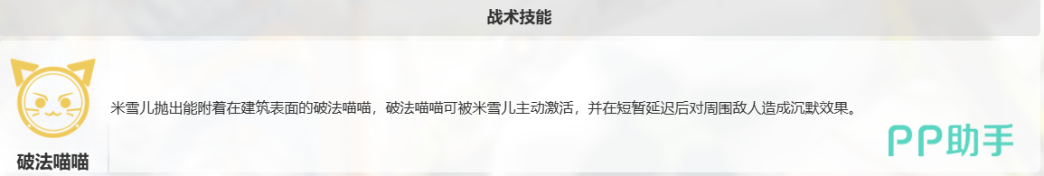 米雪儿作为一名在卡拉彼丘中的支援角色,无论是她的技能还是被动,都有着极强的控制效果,在卡拉彼丘中,能为队友创造出合适的进攻时机。米雪儿的技能为“破法喵喵”,使用技能时,米雪儿会抛出可以附着在建筑表面的破法喵喵,破法喵喵可被米雪儿主动激活,并在短暂延迟后对周围敌人造成沉默效果。合理的使用战术技能,能为我们创造出其不意的效果。