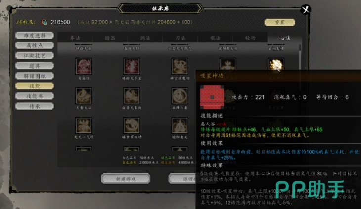 四象无极功心法堪称心法界的顶级存在,从武当处请教习得,其拥有100%的攻击加成,效果极为逆天,能大幅提升剑系角色的输出能力,在战斗中给予敌人强力打击,是剑系流派的核心增伤心法,无论前期还是后期,都占据着至关重要的地位,混元神功可以于名剑山庄请教获取,当剑气达到9层时,可提供剑招加成,钓鱼以剑为武器的角色而言,这一心法几乎是必备挂件,能显著增强剑招威力,让剑系技能的伤害更上一层楼。