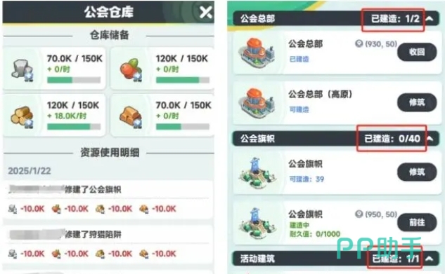 此外想要获取更多资源的玩家还可以选择加入公会,在公会中,每扩张一块地,都可以给对应仓库的资源增加产量,而公会管理则需要结合后续的公会活动进行精心策划,在修筑建筑时优先考虑有加成的板块,同时公会的收益也是十分可观的,其中主要包括战果宝箱以及巨兽讨伐,在巨兽讨伐活动中,玩家可以报名讨伐并控制传说巨兽哥罗亚和泰坦巨兽泰斯。