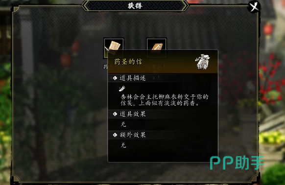 从对话中得知大名鼎鼎的药圣也正在找此物,这时把我们手上的异种金蝎送给他,让他进行转交然后直接出城,这个时候打开背包,能看到获得了一封药圣的信件,点击使用信件。