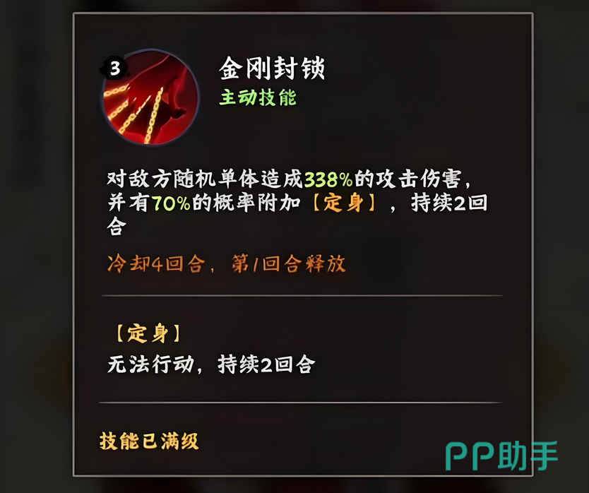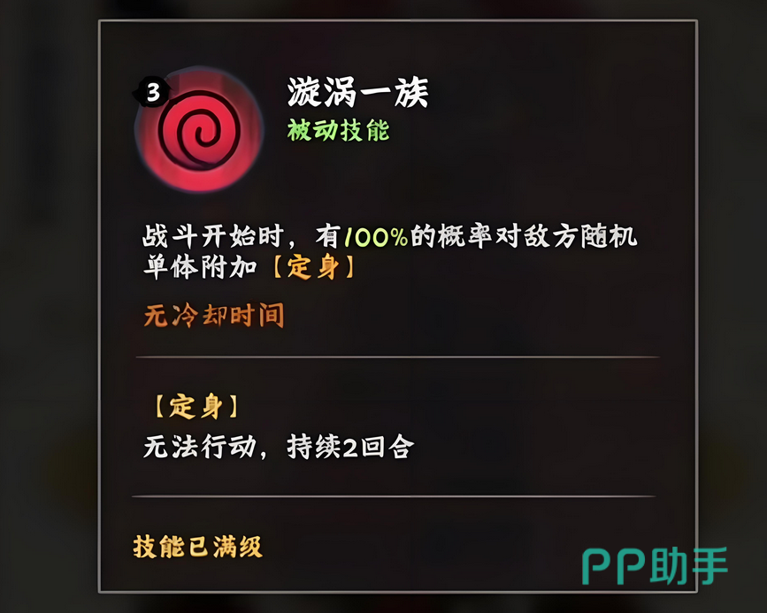 漩涡玖辛奈的主动技能金刚封锁,可对敌方随机单位造成338%的攻击力伤害,并有70%的几率附加定身,持续两个回合。对方被定身之后就无法行动,而且不用担心受到攻击后会解除效果,这一点比束缚要好一些。被动技能漩涡一族在战斗开始时有100%的几率对敌方随机单位附加定身,这个定身效果同样持续两个回合。