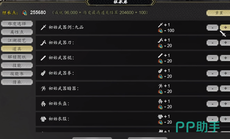 另外可以优先去选择心法,比如增加易筋经,这是能提升玩家输出能力的关键性因素,另外武功对于玩家来说也是非常重要的,可以去选择自己喜欢的流派,然后分配上2000左右的继承点,另外武器也可以进行少量的继承点分配,这样武器变得更加厉害之后,玩家前期的攻击能力也会变得更优秀。