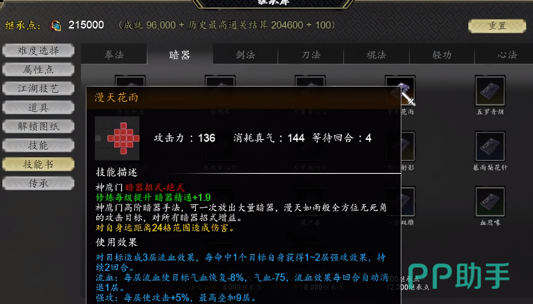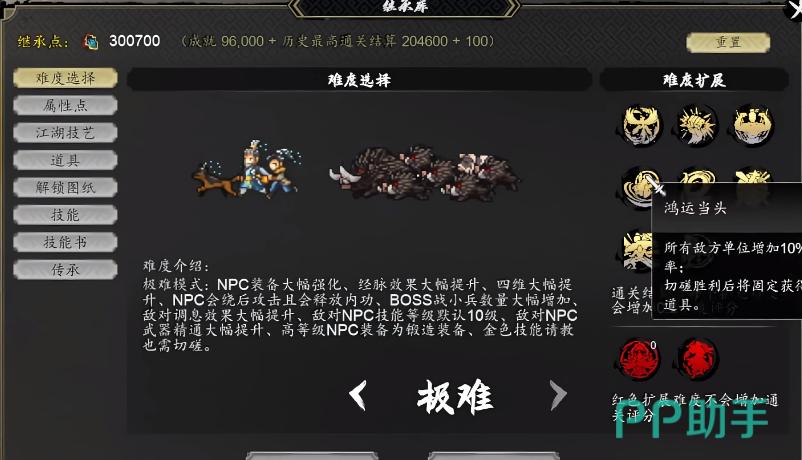 在游戏里会设定大量的周目,每个玩家都可以在游戏里根据之前的表现获得相应的点数,这个点数可以继续分配到武学装备,也可以去兑换钱币,帮助玩家在下一次挑战中,能有一段更独特的冒险旅程,如果想要进行技能点的分配,玩家首先需要往钱币、经脉,还有武学点以及各种心法武功上进行分配,首先最应该就是去分配经络点,经络点在游戏里是固定的数值,对于玩家的战力提升是有很大帮助的,最好是使用三千点左右分配到经脉上,这样可以让玩家在初期就有比较优秀的能力。