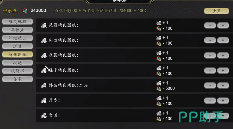 除了这些常规的继承点之外,还有很多玩家都比较容易忽略的图纸,可以对高级帽子进行继承点的分配,4瓶以上的帽子都可以提升回血效果,这样玩家也能拥有更强的战斗能力,如果还有其他的继承点就可以分配到经脉点上,也可以去选择各种武学,让角色可以拥有更优秀的战斗能力。